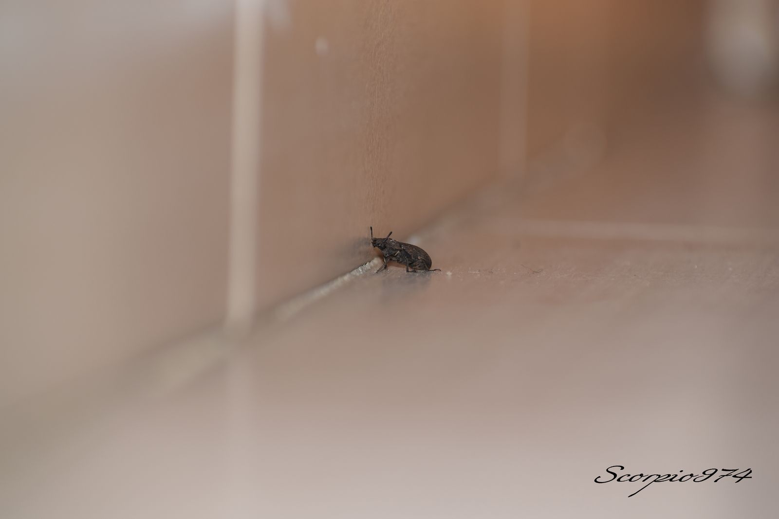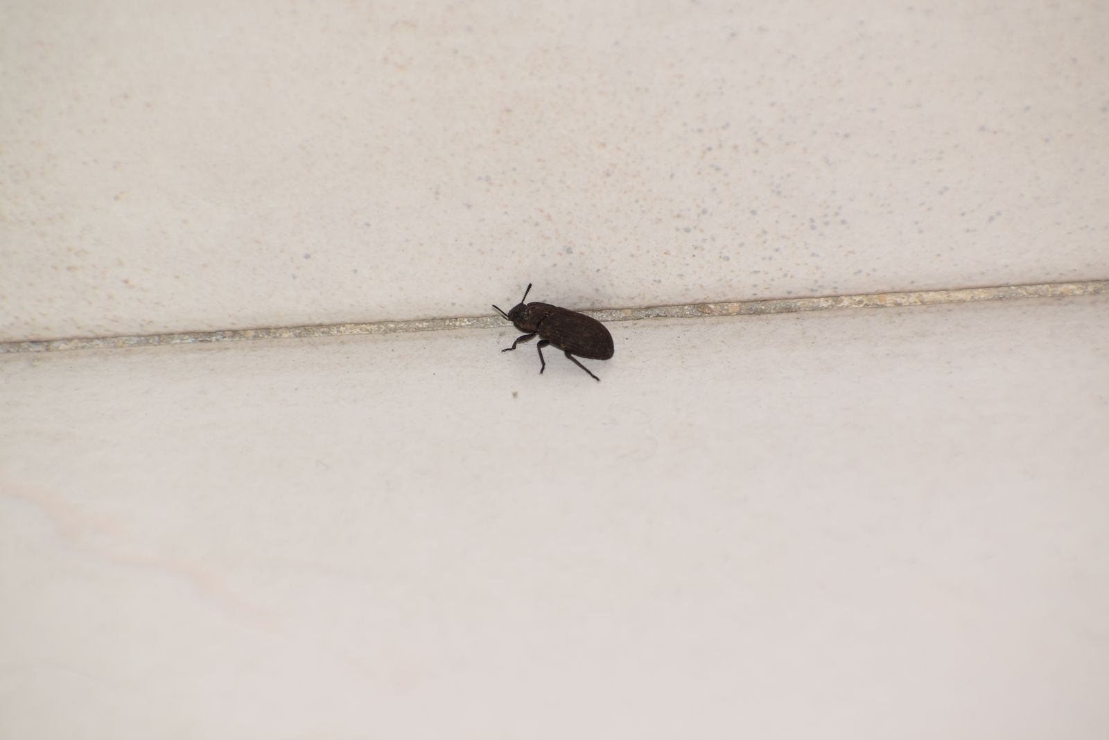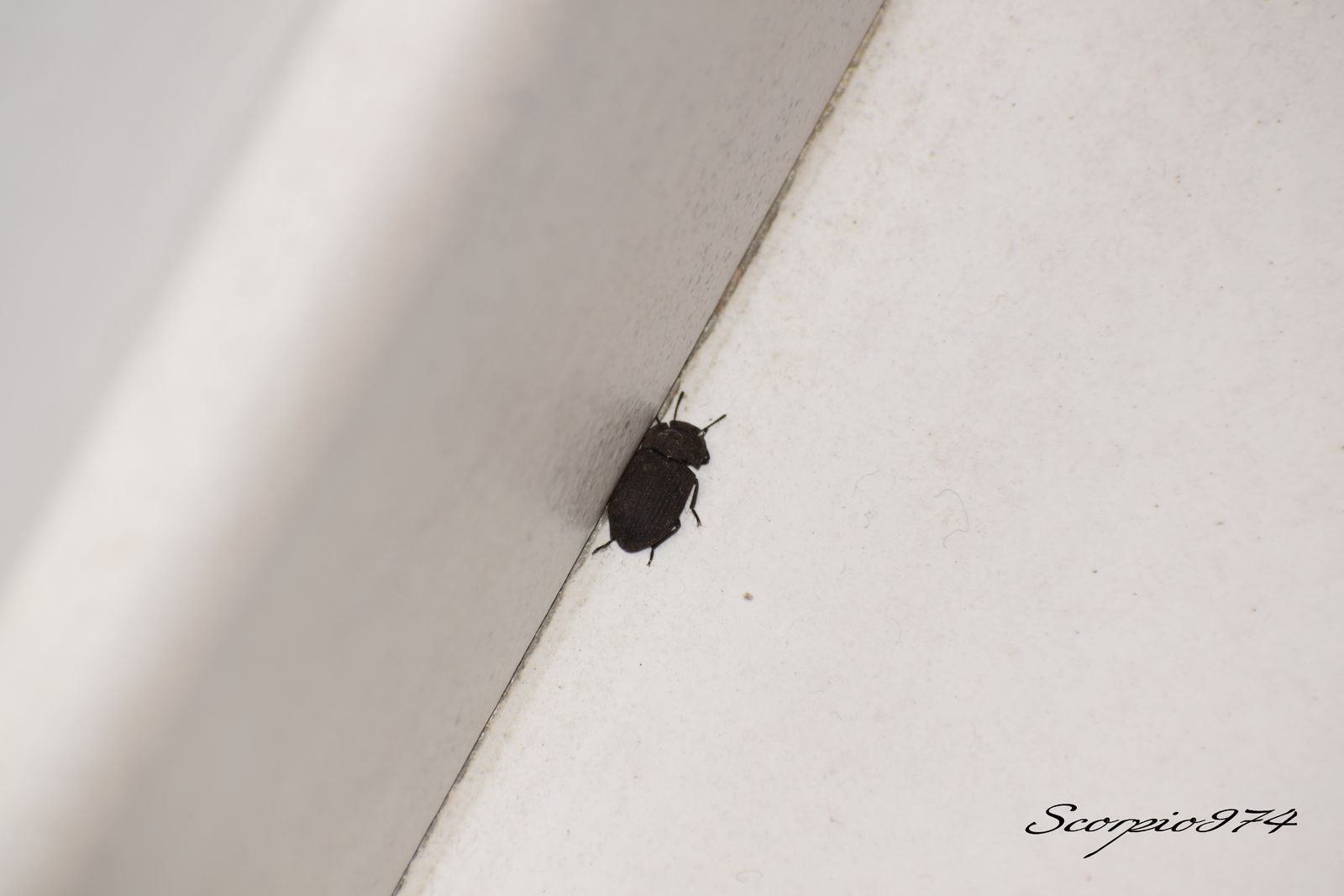 De l'ordre des coléoptères, le Gonocephalum simplex (Fabricius, 1801) est un insecte qui se déplace, en général, à la surface du sol et ne devrait pas se retrouver au niveau d'un étage dans un immeuble. Mais bon, il faut croire que celui-ci est un aventurier.